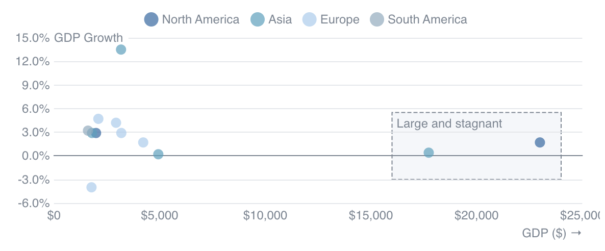 <ScatterPlot data={countries} x=gdp_usd y=gdp_growth_pct1 tooltipTitle=country series=continent>